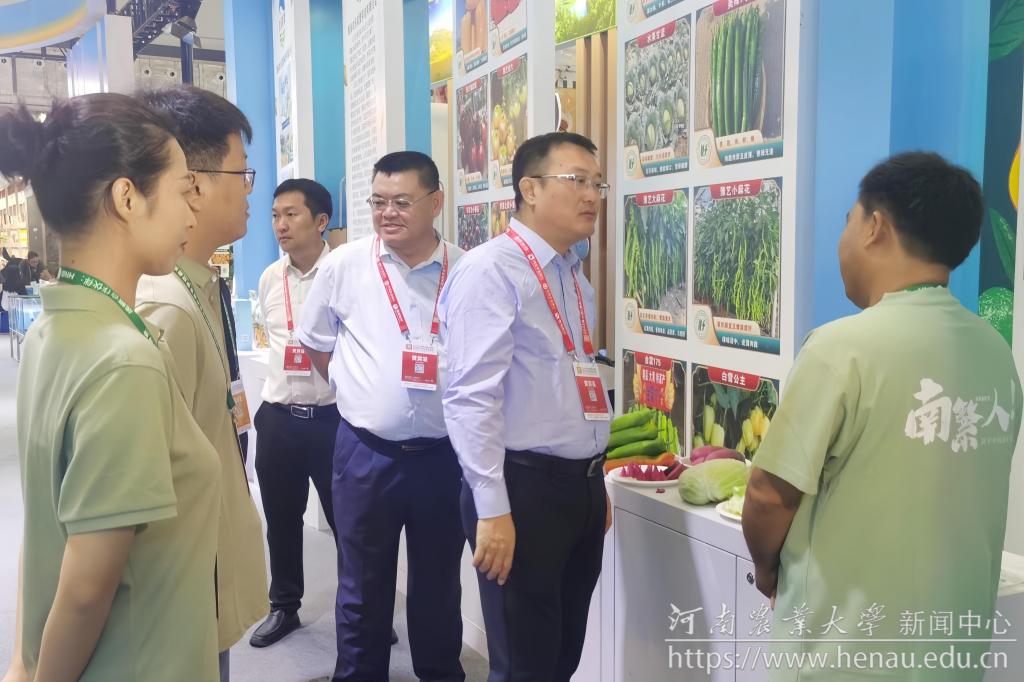 展览期间,乐东县委书记孙世文等领导到学校展位参观,并听取南繁研究院工作人员汇报,对我校近年来在乐东开展的农业科研和成果推广等相关工作给予了充分肯定,并希望学校继续发扬科研、人才等优势,将南繁成果落地海南、扎根乐东,培育产业链,助力当地特色高效农业转型升级。